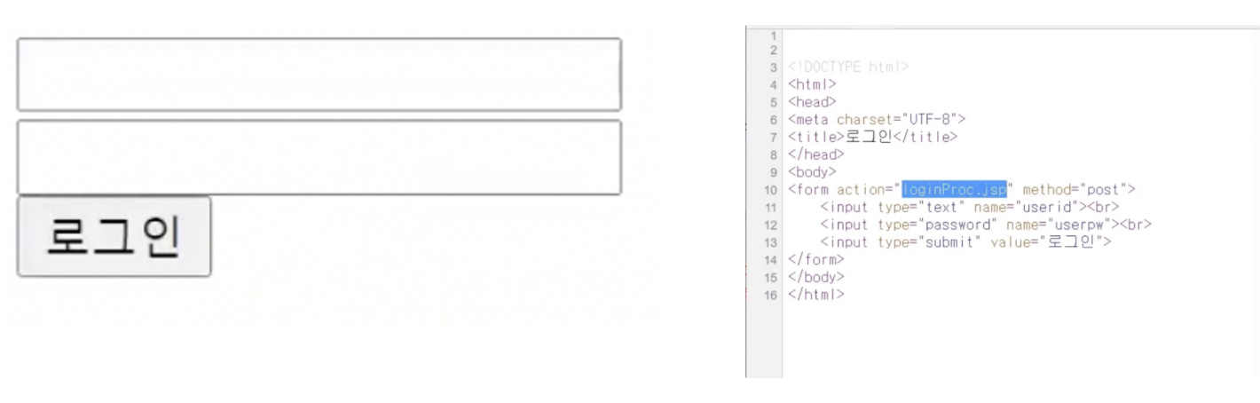 현재 이 페이지는 로그인 시 action이(로그인 버튼 클릭시 요청하는 경로) loginProc.jsp로 처리가 되어있다.