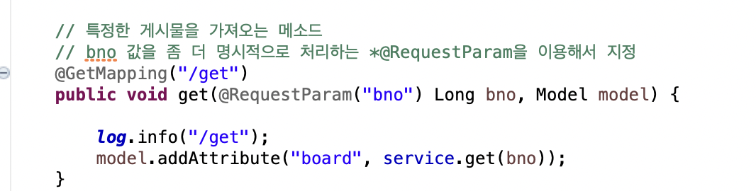 게시물 조회는 BoardController를 보면 get() 메소드로 작성하였다.