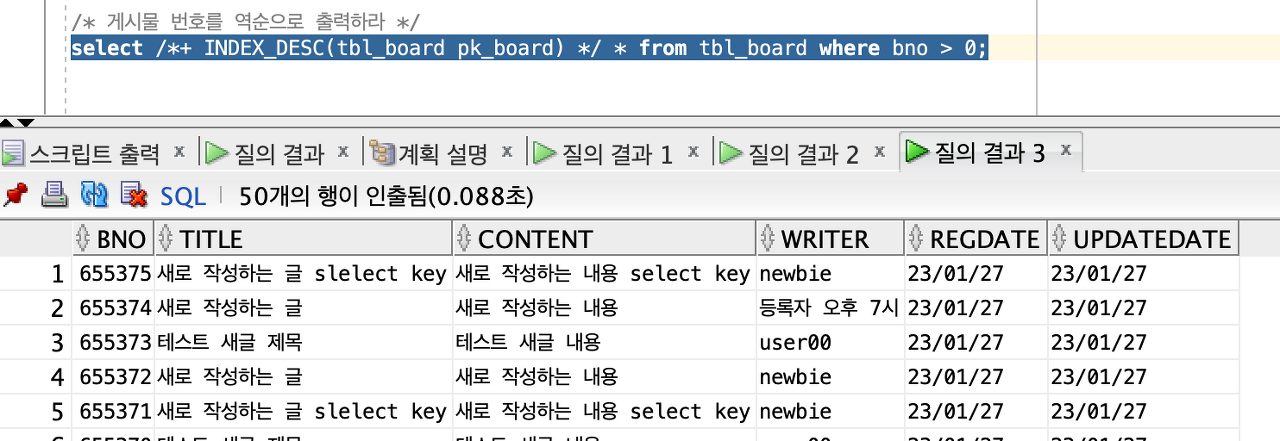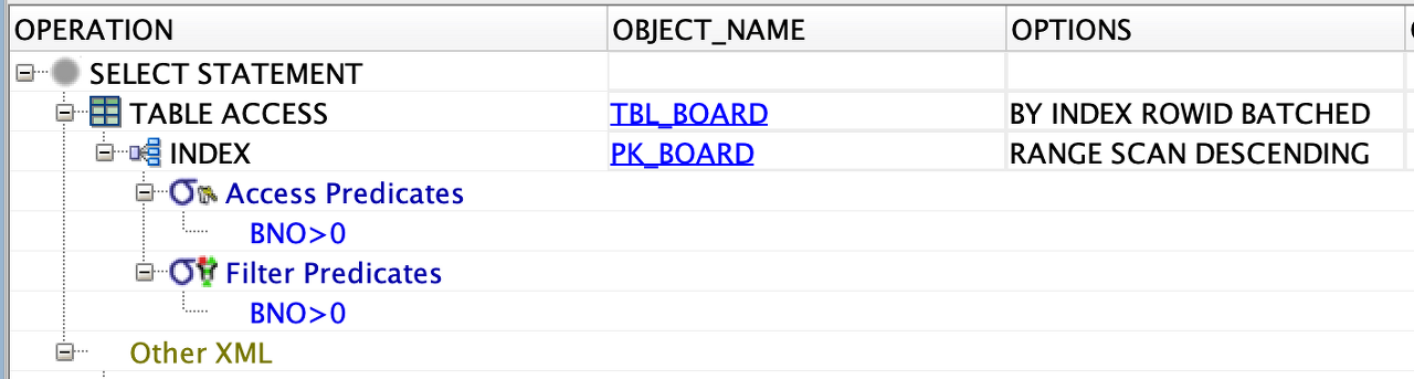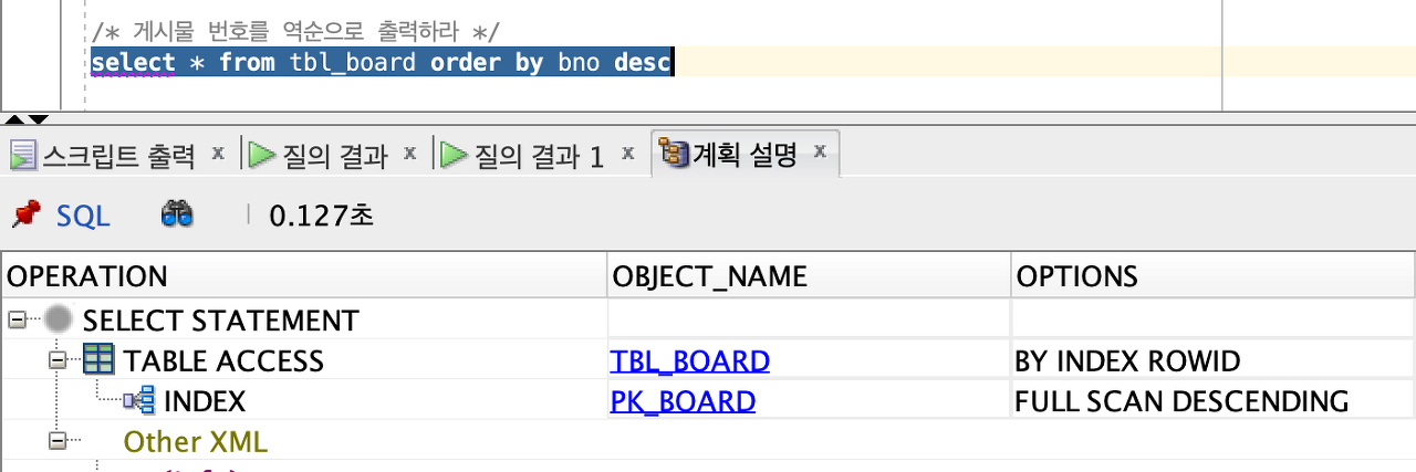 PK_BOARD라는 인덱스를 이용하는데 DESCENDING을 하고 있다.