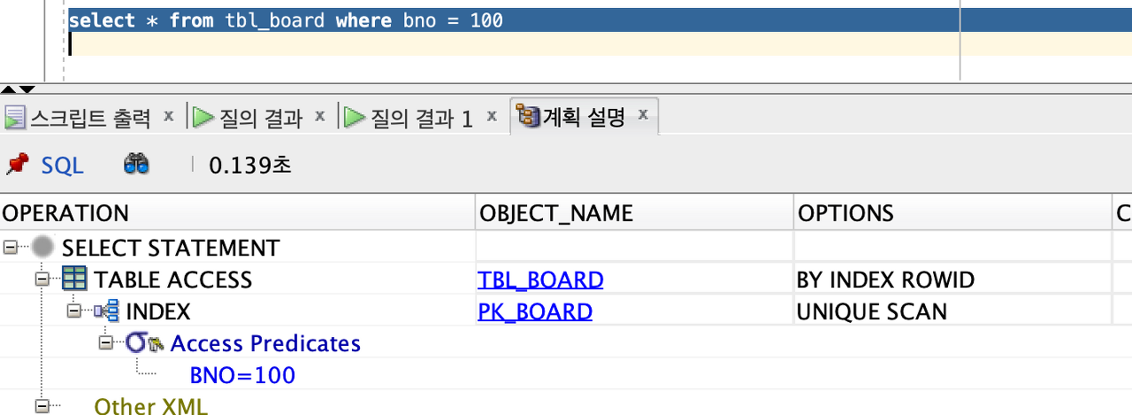 해석 : “PK_BOARD에 INDEX를 뒤져서 ROWID를 이용해서 TBL_BOARD의 TABLE access 하는 방식”