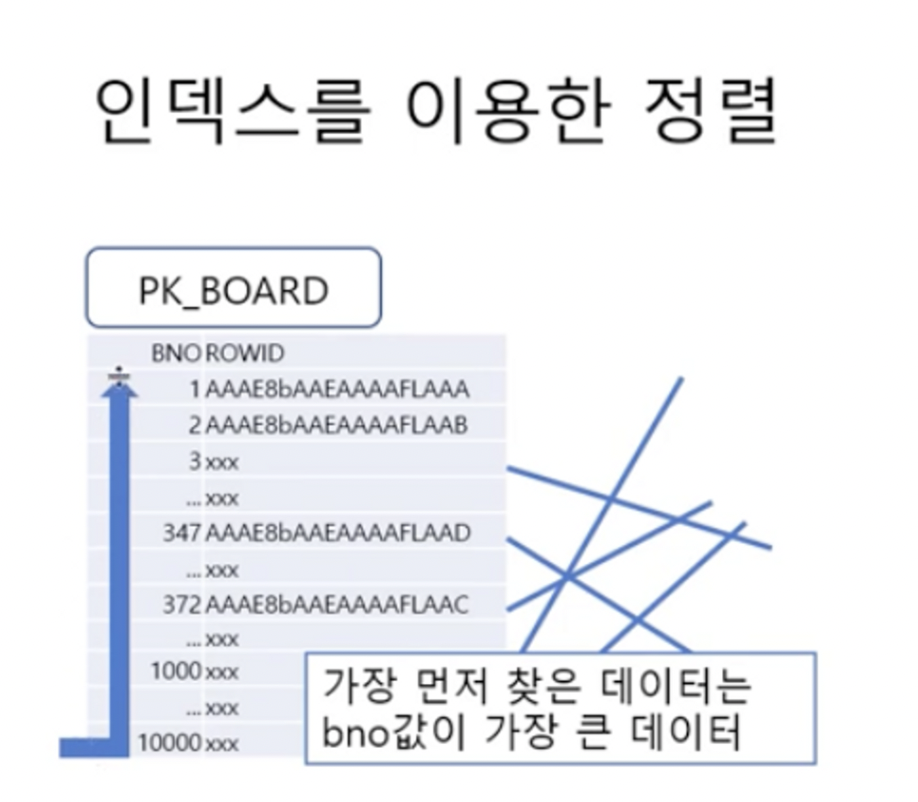 하지만 이미 정렬된 BNO를 사용하여 ROWID 값과 일치한 데이터를 빠르게 정렬된 값으로 뽑을 수 있다.