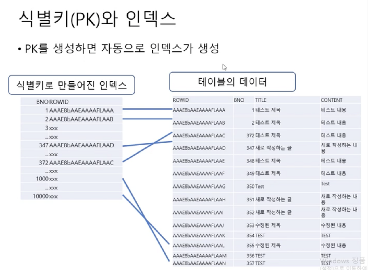 PK 지정 이유는 ‘식별’에 의미가 있지만 구조상으로는 ‘인덱스’라는 존재(객체)가 만들어지는 것을 의미한다.