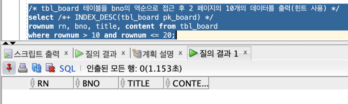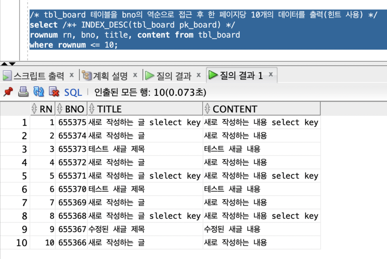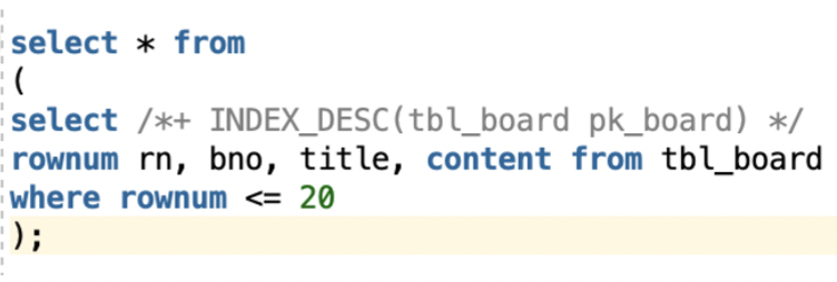 select /*+ INDEX_DESC(tbl_board pk_board) */