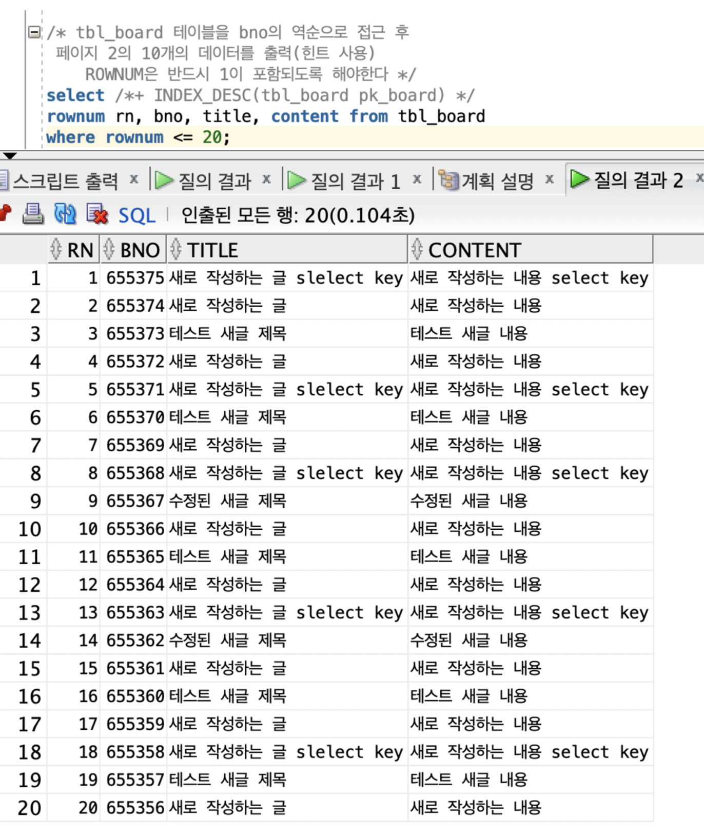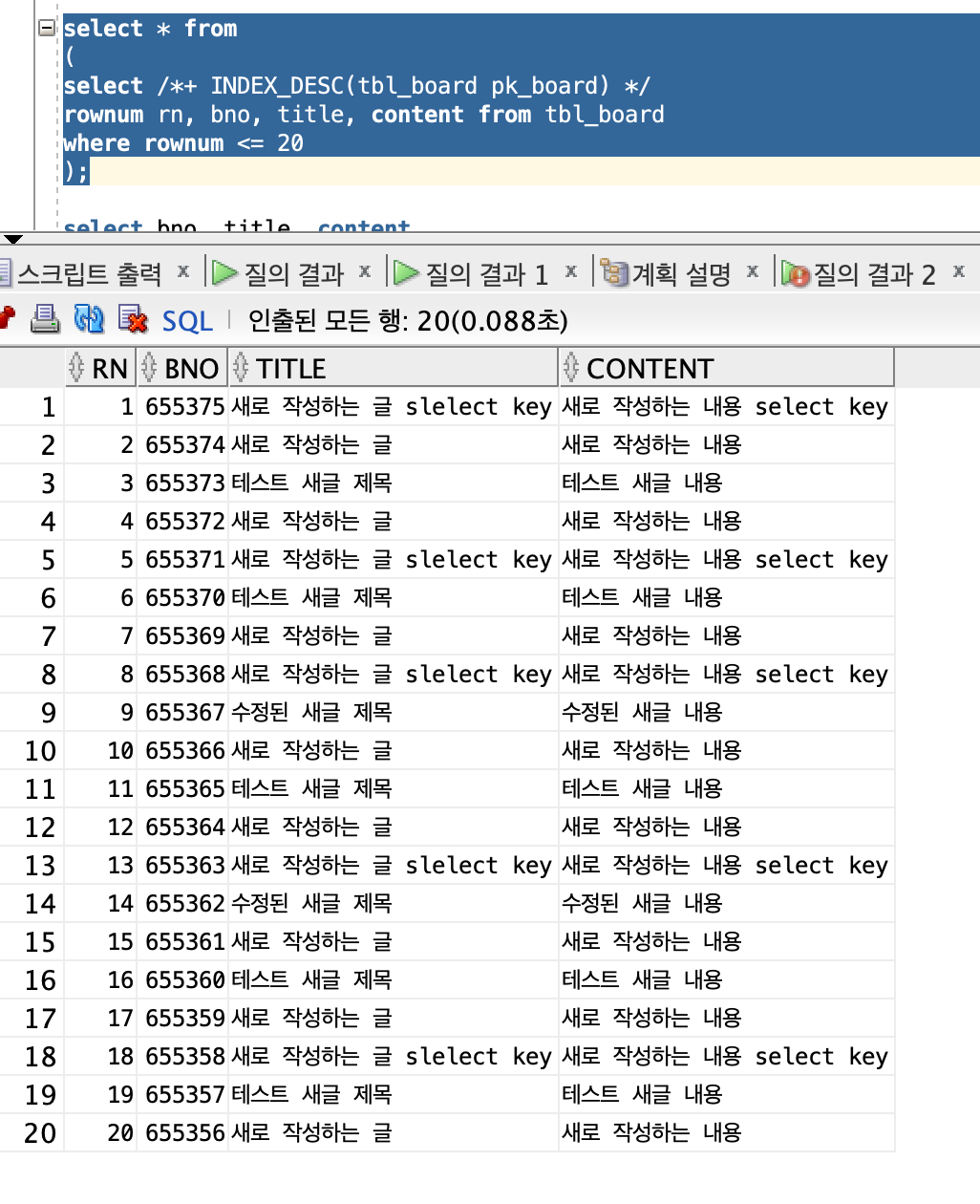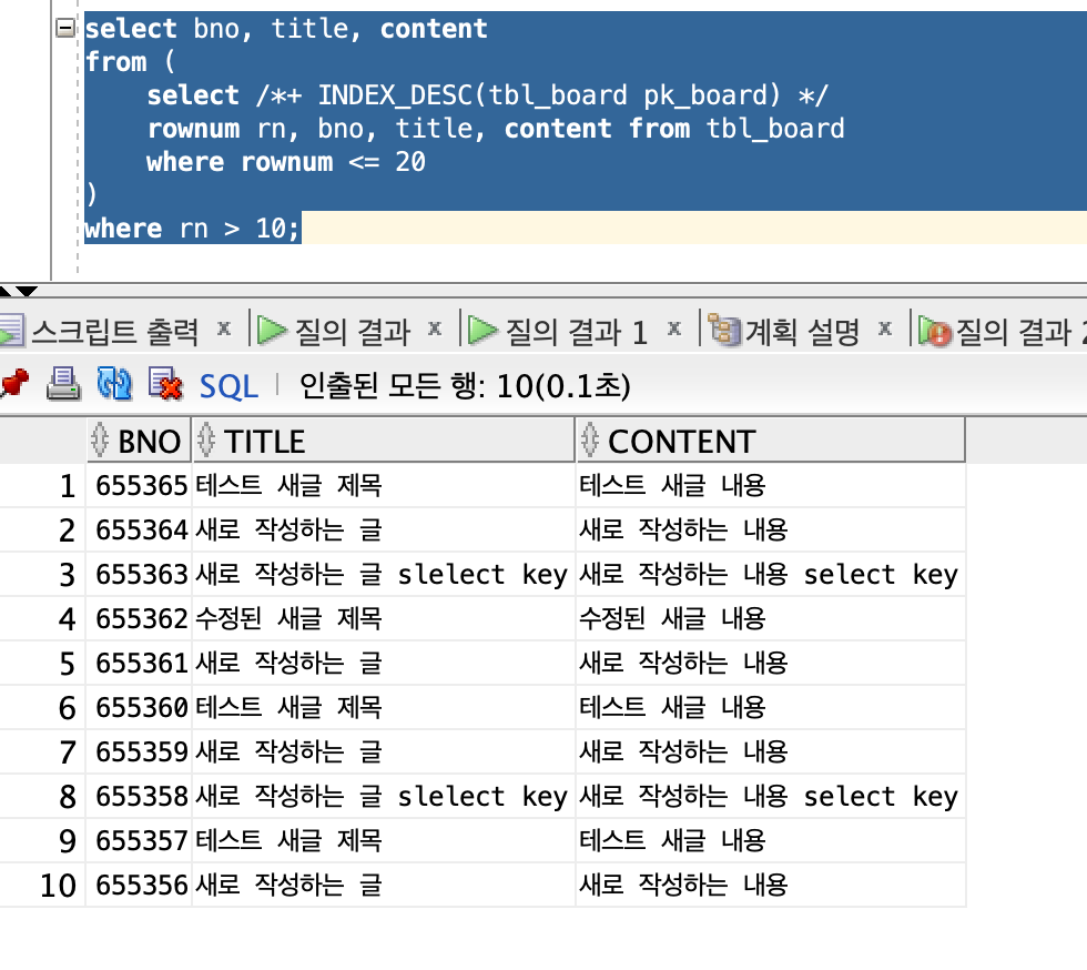 SQL의 실행결과를 보면 가장 높은 번호의 게시물 10개만 출력되는 것을 볼 수 있다