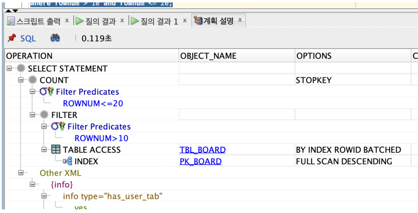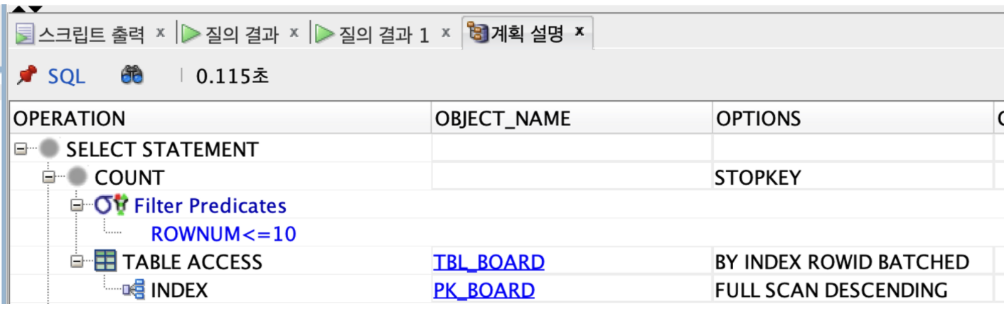 이때 실행 계획을 통해 PK_BOARD 인덱스를 역순으로 접근하는 것을 확인할 수 있다.