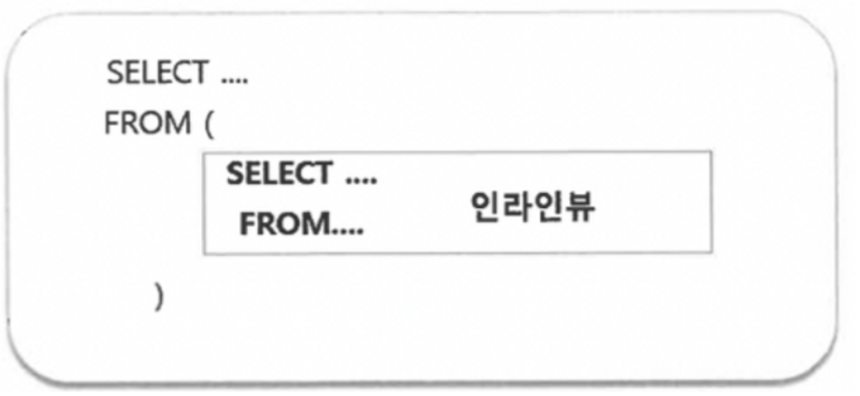인라인뷰는 논리적으로는 어떤 결과를 구하는 SELECET문이 있고