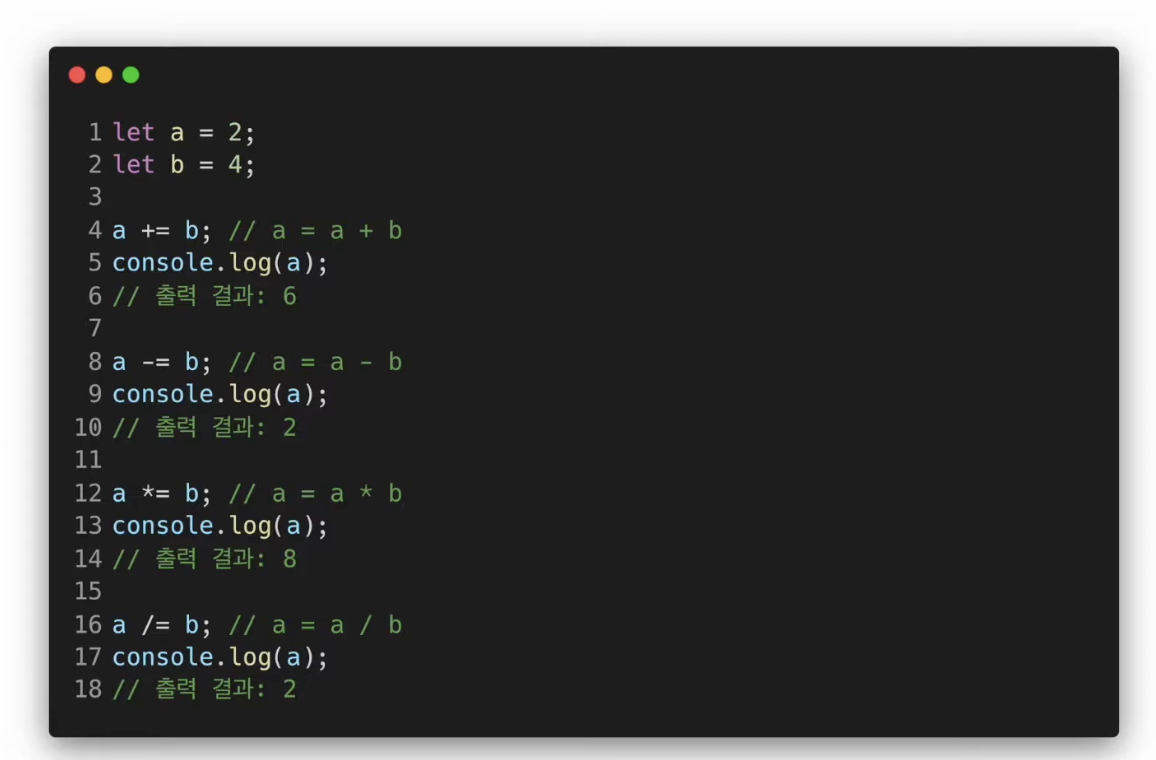 추가로 산술 연산자들은 대입연산자와 함께 쓰이는 경우가 많다.