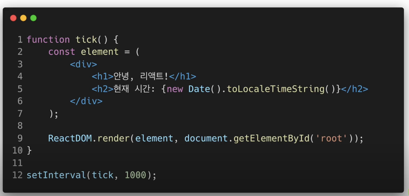 tick() 함수는 현재 시간을 포함하고 있는 엘리먼트를 생성하여 'root' <div>에렌더링하는 역할을 한다.