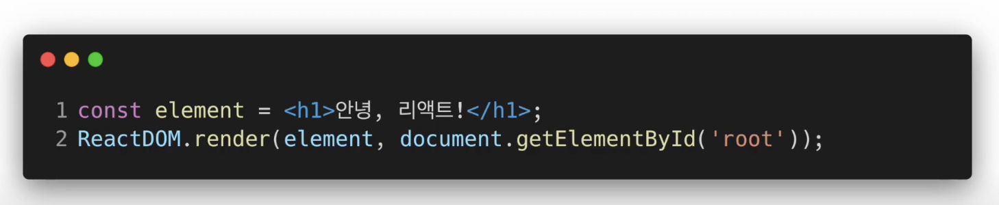 이 코드는 먼저 엘리먼트를 하나 생성하고 생성된 엘리먼트를 'root' <div>에 렌더링 하는 코드이다.
