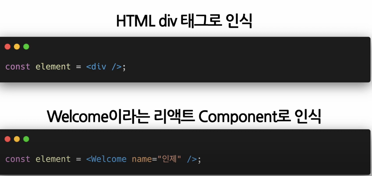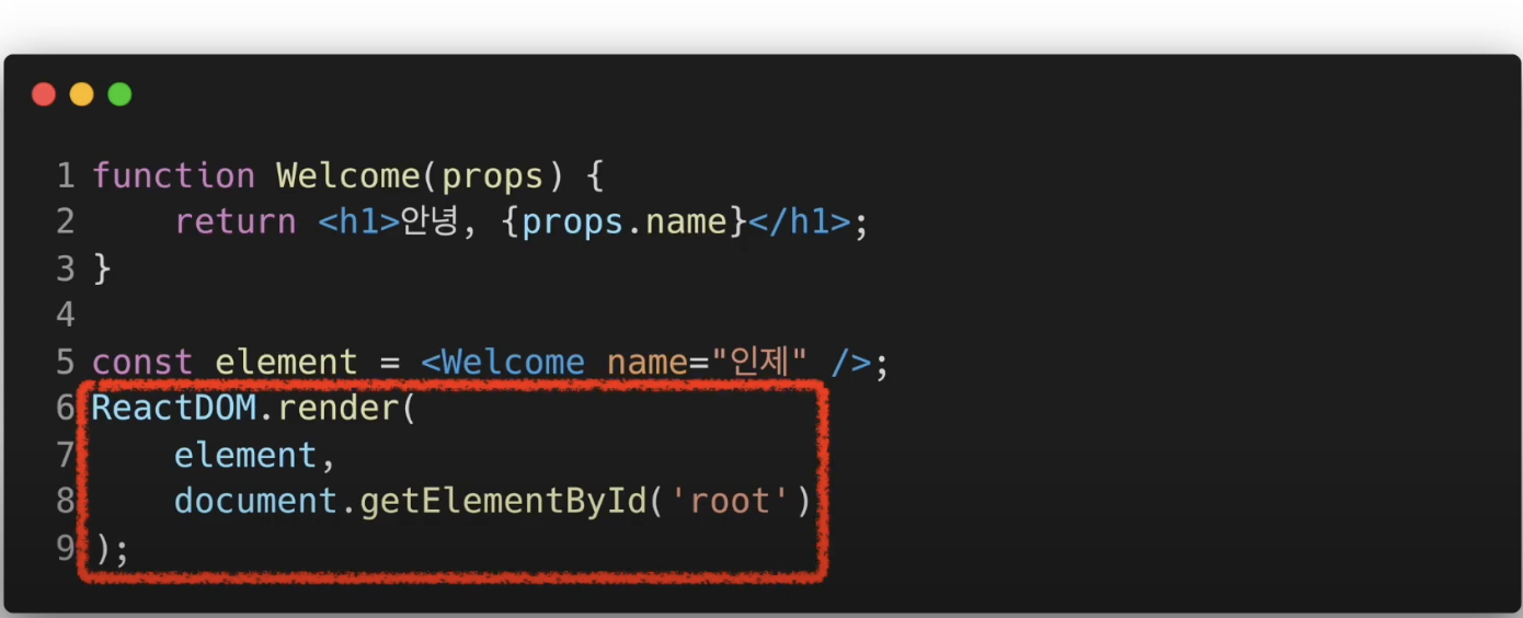 그리고 Welcome name = "인재"라는인재" 라는 값을 가진 element(변수)를 파라미터로 해서 ReactDOM.reder() 함수를 호출한다.