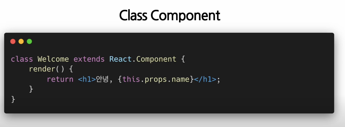React.Component라는 클래스를 상속 받아 Welcome이라는 클래스를 만들었고