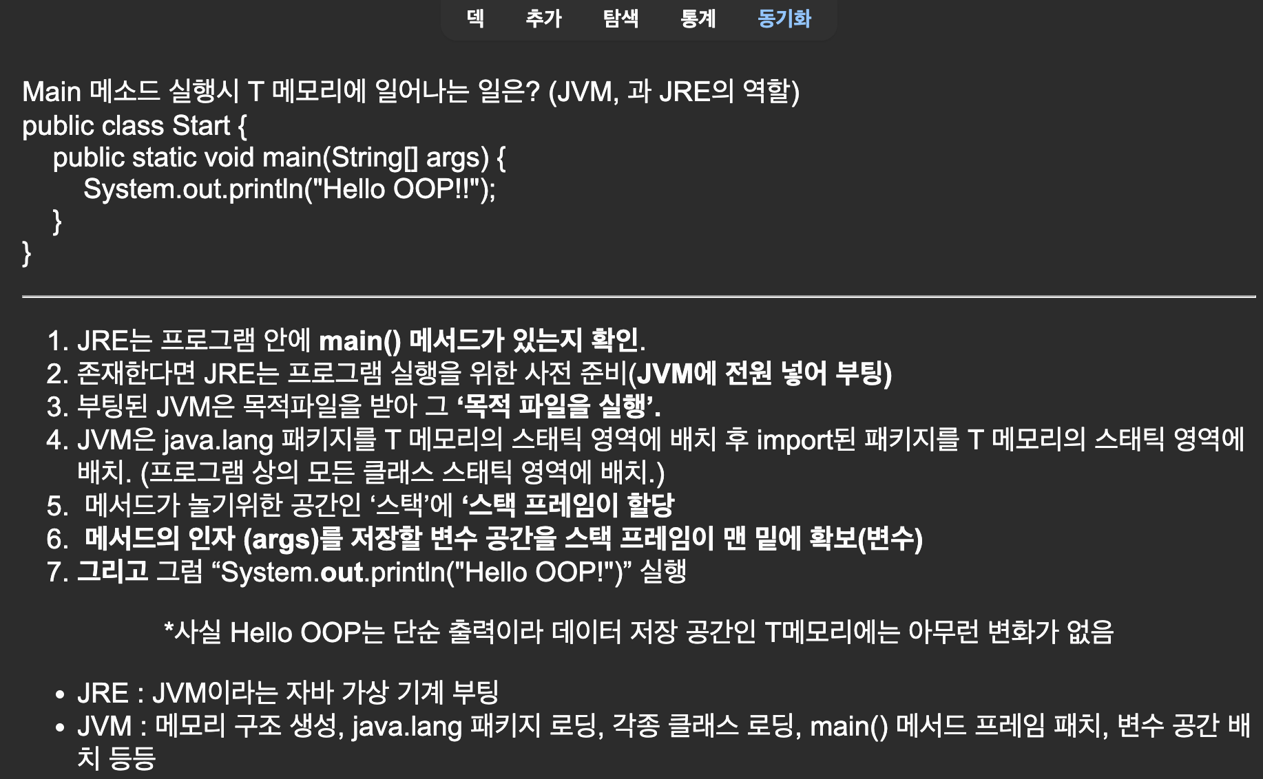 [ANKI] - 31. Main 메소드 실행시 T 메모리에 일어나는 일은? (JVM, 과 JRE의 역할)(07.04) 본문