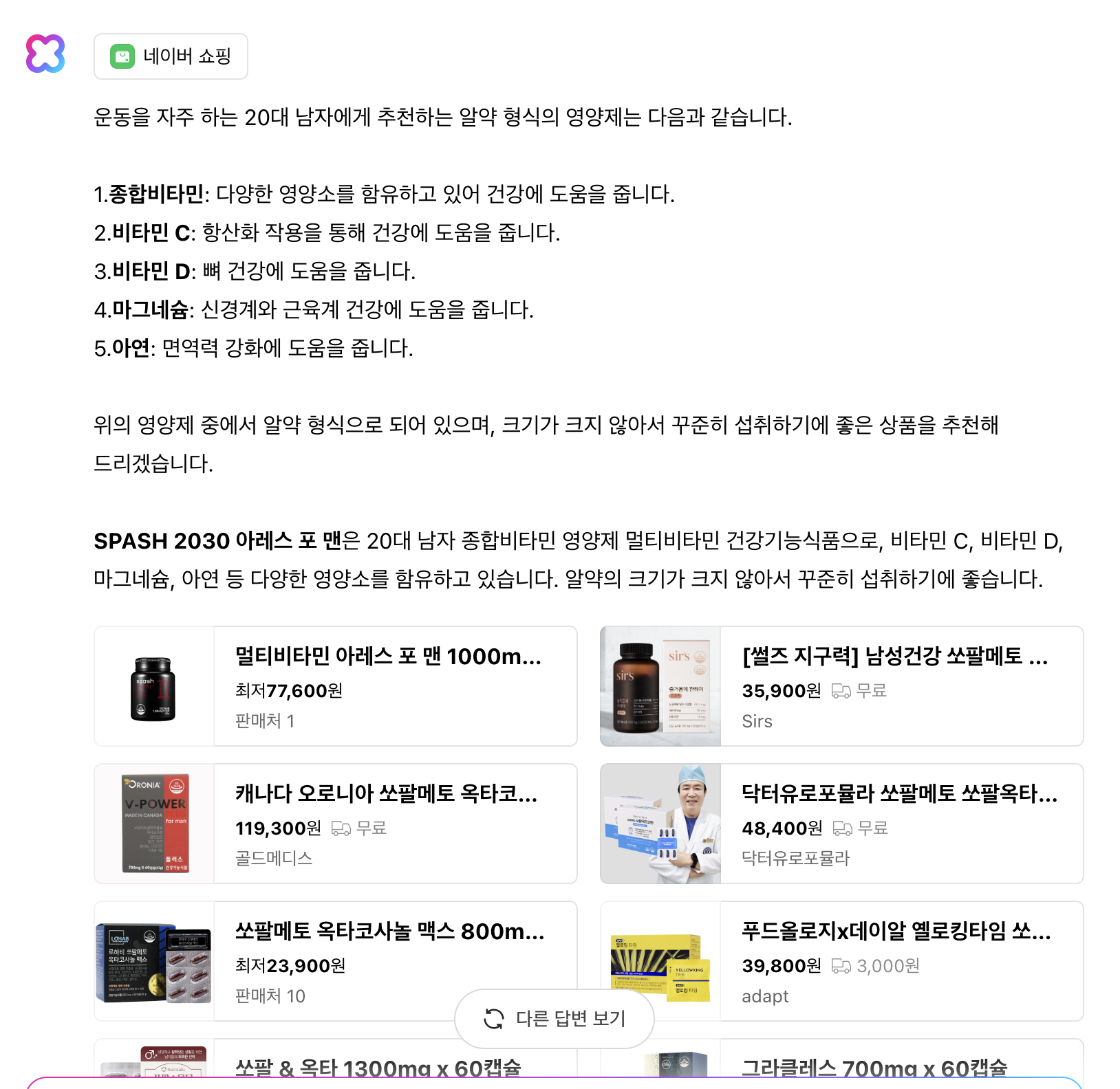 - 예) "남자에게 좋은 영양제 추천해 줘" 보다는 -> "20대 초반 저체중 남자에게 좋은 알약 형식의 영양제를 추천해줘"