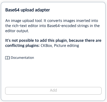 - (중요) 기본적으로 BASE 64 어뎁터 선택 불가. 따라서 file manager 역할을 하는 (유료) CK BOX를 제거해야 ‘선택 가능’으로 변경된다.