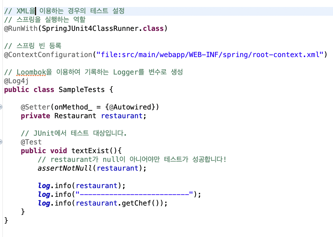 - ex00 → src/test/java → 폴더에 org.zerock.sample.SampleTest 클래스 작성