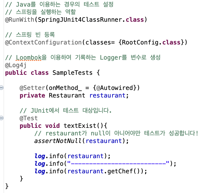 - @RunWith는 '나는 이 클래스를 가지고 테스트를 진행 할 거야' 라는 어노테이션
