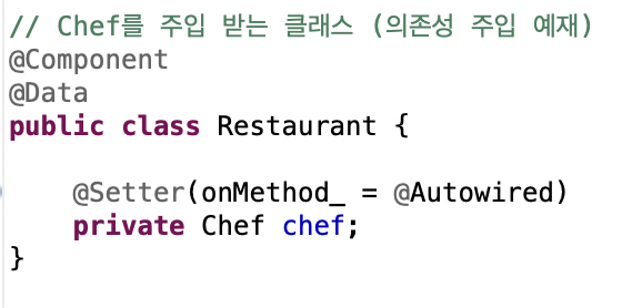 - setter 메서드 생성 시 메서드의 추가할 어노테이션을 지정(예제는 @Autowired 사용)