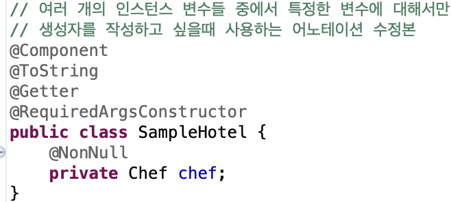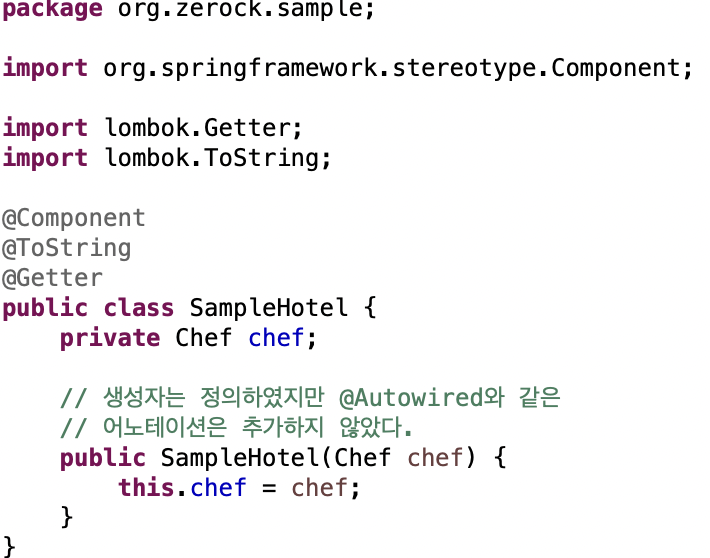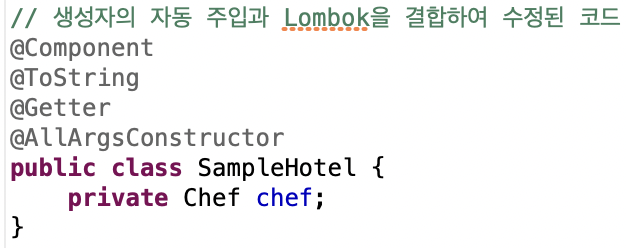 생성자 자동 주입과 Lombok을 결합하면 SapmpleHotel은 아래와 같이 변경이 가능하다.