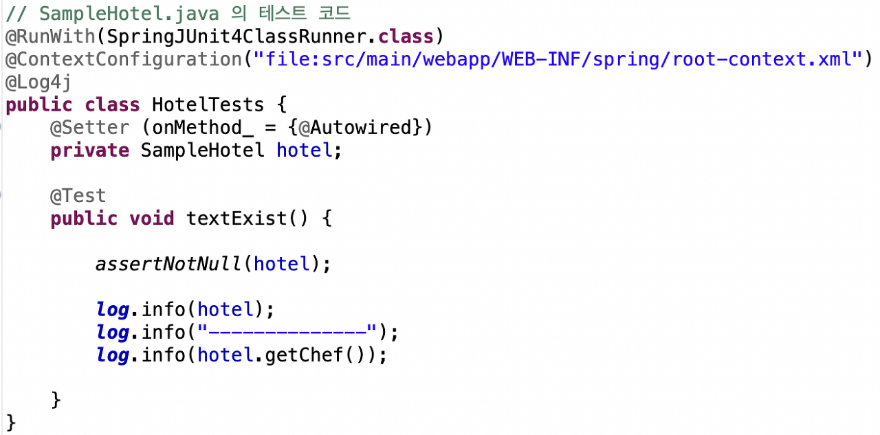 SampleHotel에 대한 테스트 코드(HotelTests)는 아래와 같다.