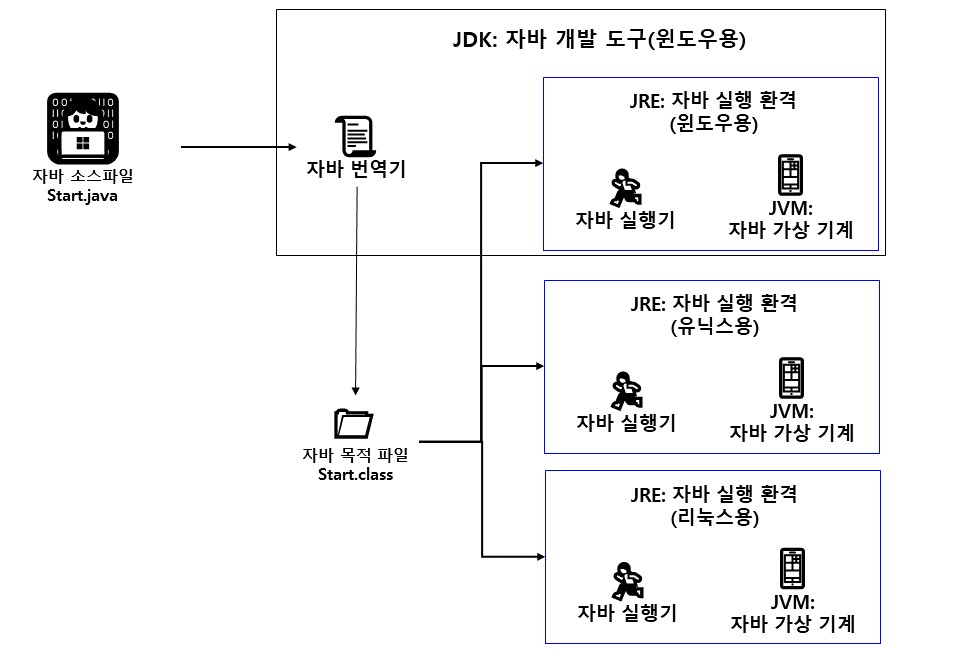 자바 개발자는 사용 중인 플랫폼에 설치된 JVM용으로 프로그램을 작성하고 베포 하면 각 플랫폼에 맞는 JVM이 중재자로서 각 플랫폼에서 프로그램을 구동하는 데 아무 문제가 없게끔 만들어주는 것이다.