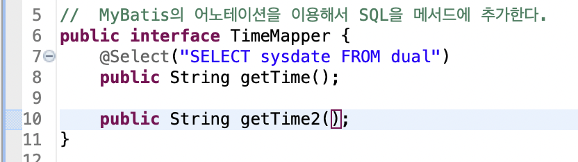 우선 Mapper 인터페이스와 XML을 같이 이용하기 위해 기존 TimeMapper 인터페이스 파일에 메서드 추가.