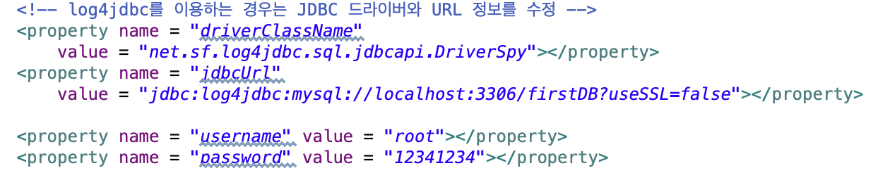 log4jdbc를 이용하는 경우는 JDBC 드라이버와 URL 정보를 수정해야 합니다.