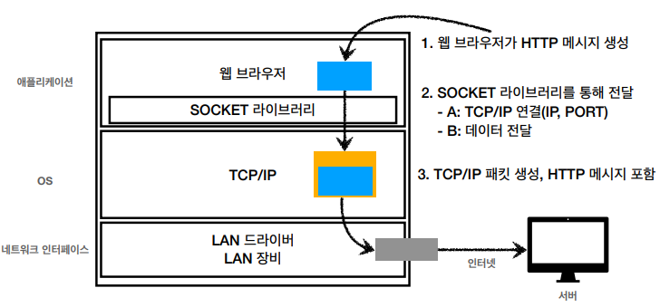 - 소켓 라이브러리를 통해 HTTP 메시지를 TCP/IP 계층으로 전달한다.