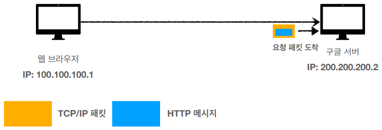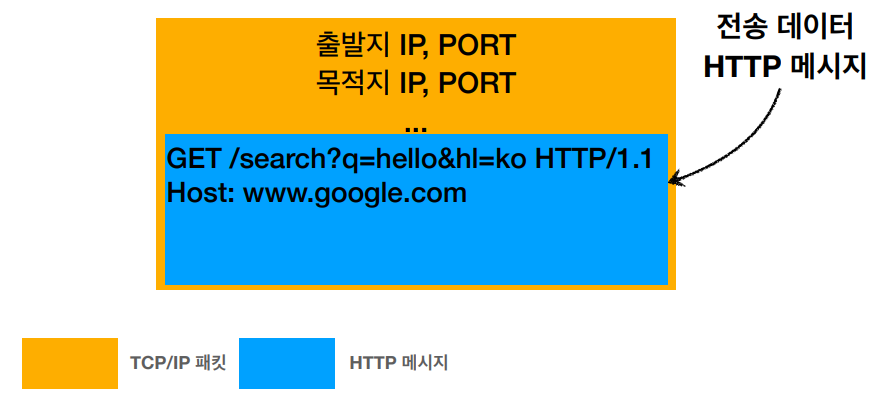 헤더 부분에 출발지 IP, PORT, 목적지 IP, PORT 정보등을 담고 데이터 부분에 HTTP 요청 메시지를 담아 TCP/IP 패킷을 생성한다.