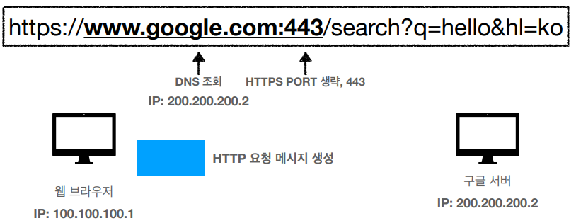 - 웹 브라우저에 입력된 URL로 부터 IP, PORT 정보를 얻고 웹 브라우저가 HTTP 요청 메시지를 생성한다.