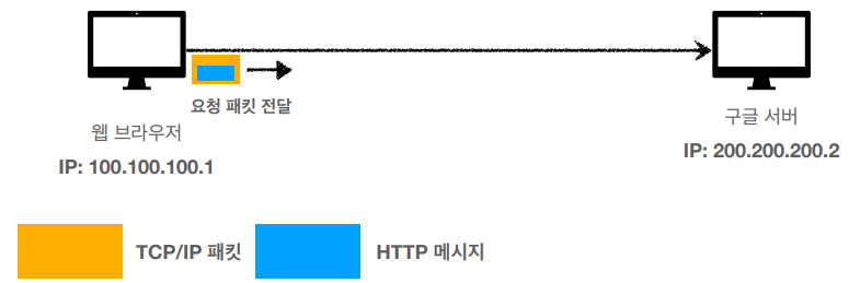 - 헤더 부분(출발지 IP, PORT, 목적지 IP, PORT 등)과 데이터 부분(HTTP 요청 메시지)을 합쳐 TCP/IP 패킷을 생성한다.