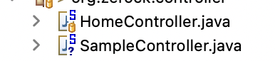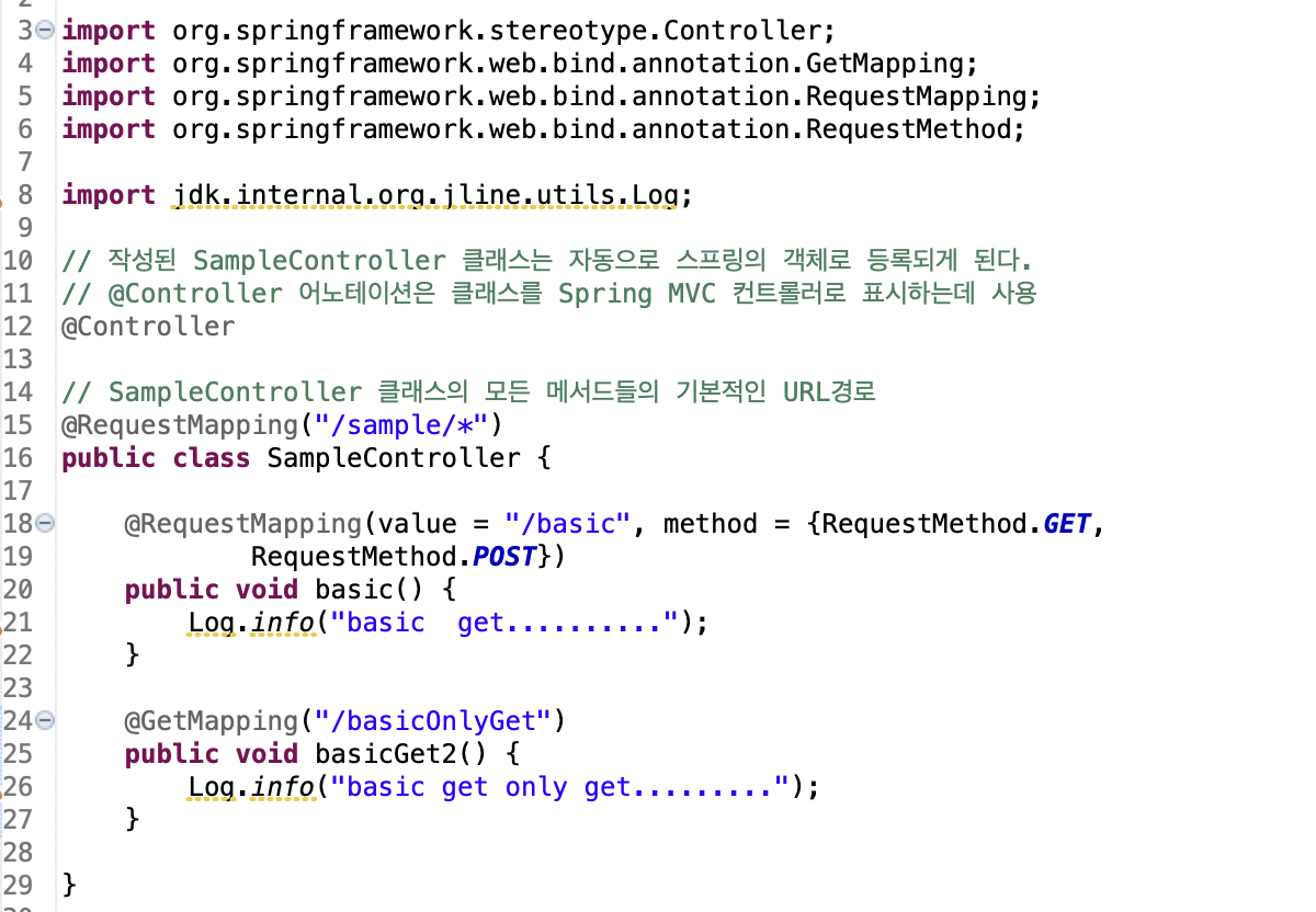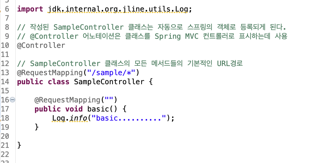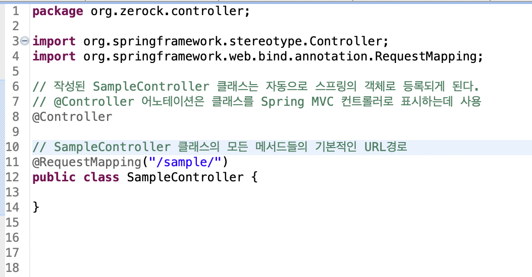 SampleController 클래스 선언부에 @Controller라는 스프링 MVC에서 사용하는 어노테이션을 볼 수 있다.