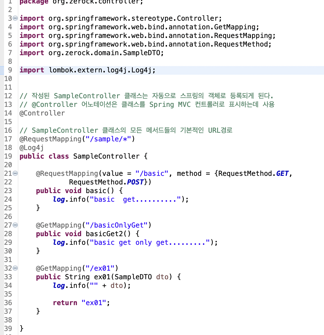 ex01() 메서드를 호출하는 경로는 ‘/sample/ex01’이 된다.