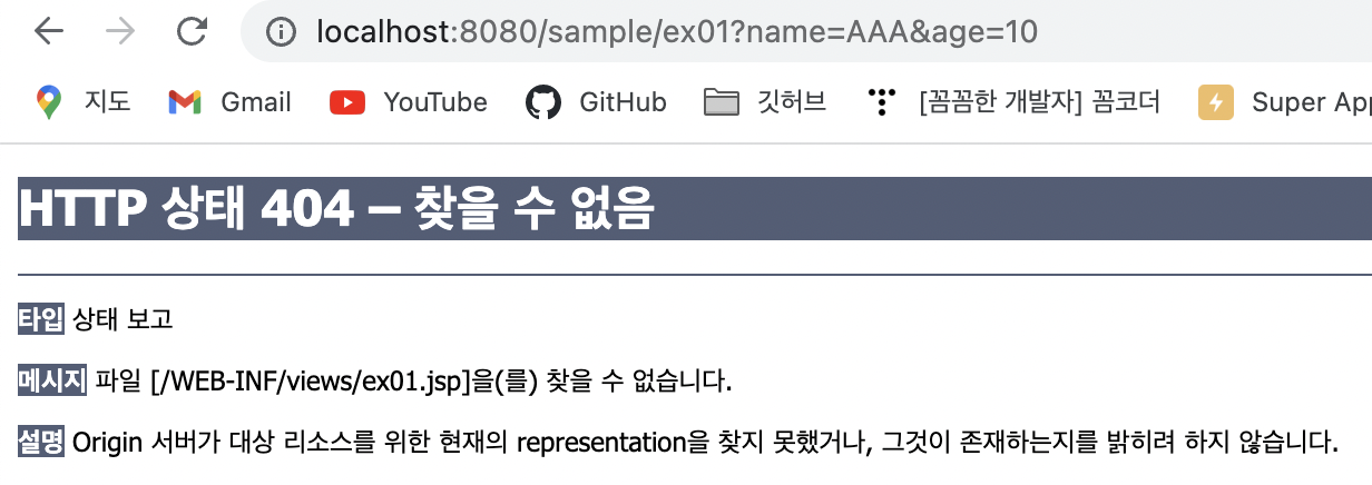 실행시 기본 경로를 ‘/’로 변경 후 실행해 보면 (http://localhost:8080/sample/ex01?name=AAA&age=10)