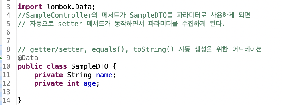 SampleDTO 클래스는 Lombok의 @Data 어노테이션을 이용해서 처리하는 걸 볼 수 있다..