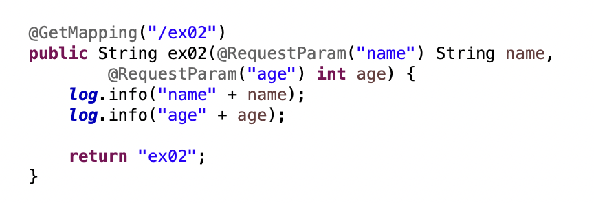 ex02() 메서드는 파라미터에 @RequestParam 어노테이션을 사용해서 작성됐다.