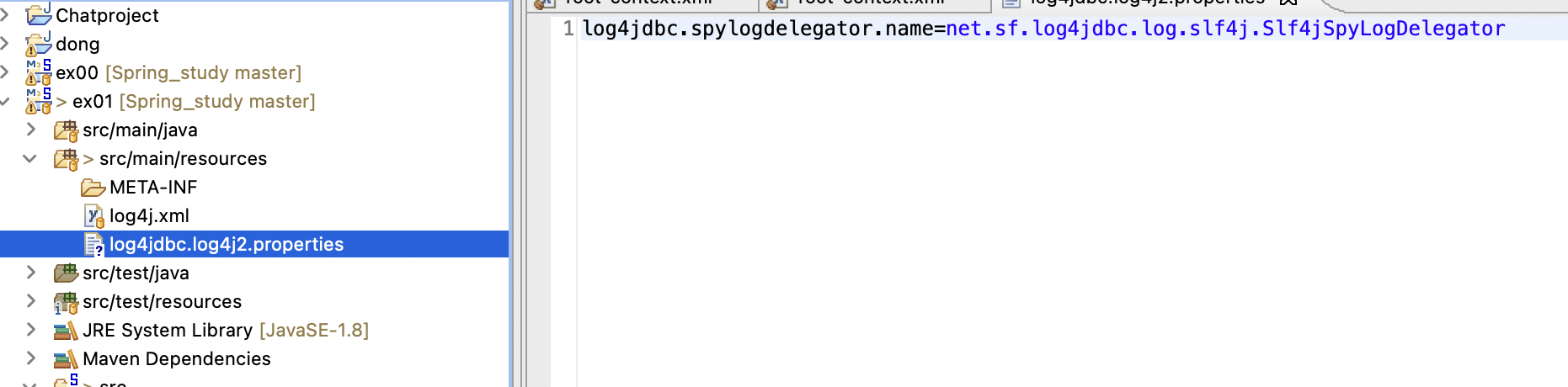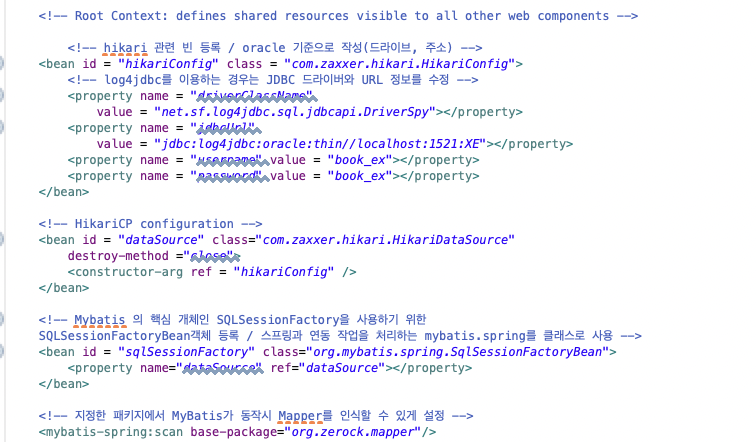 root-context.xml은 내부적으로 Log4jdbc를 이용하는 방식으로 구성되어 있으므로