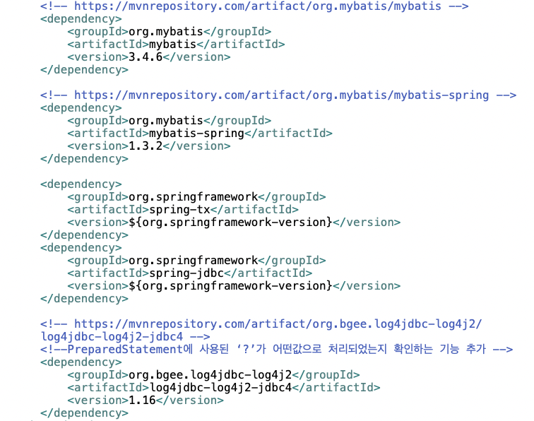 MyBatis를 이용할 것이므로 HikariCP, MyBartis, mybatis-spring, Log4jdbc 라이브러리들도 추가한다.