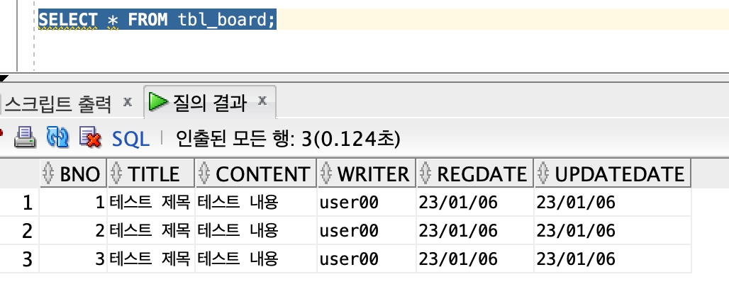 regdate와 updatedate 칼럼은 기본을 현재 시간이 들어가므로