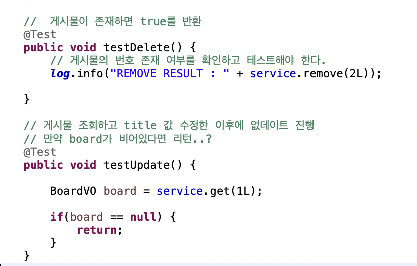 testUpdate()는 게시물 조회하고 title 값 수정한 이후에 업데이트 진행