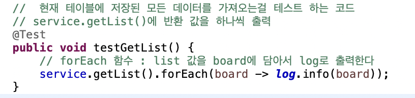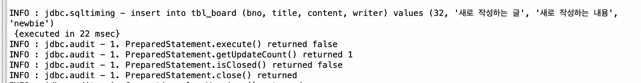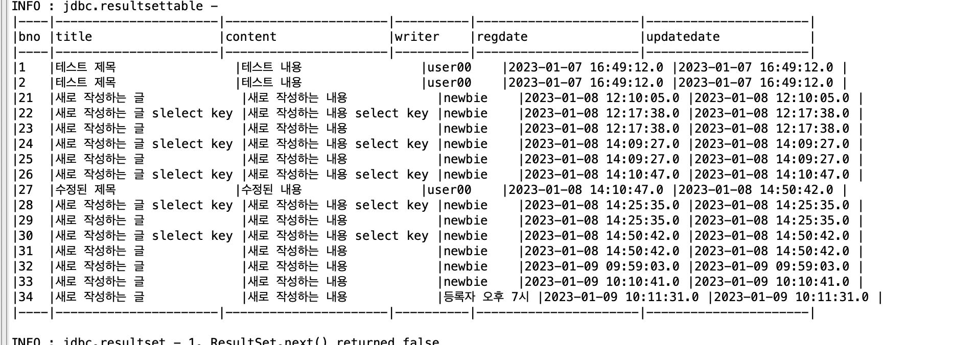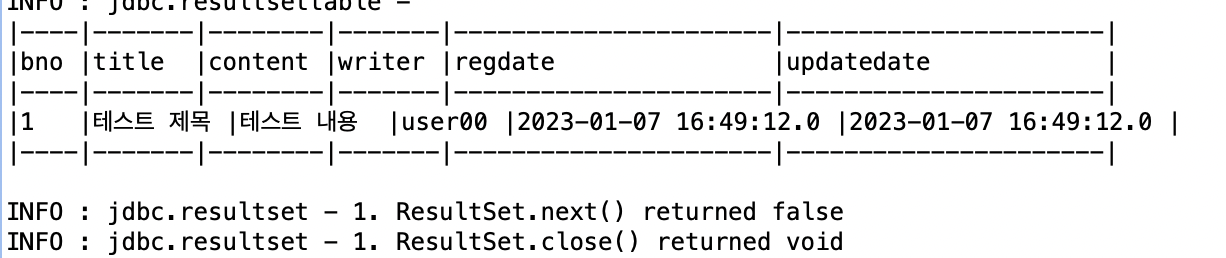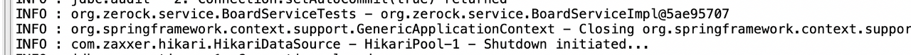 아래와 같이 BoardServiceService 객체와 데이터 베이스 관련 로그가 같이 출력된다.