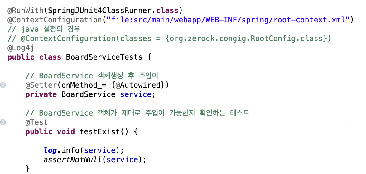BoardServiceTests의 첫 테스트는 BoardService 객체가 제대로 주입이 가능한지 확인하는 작업