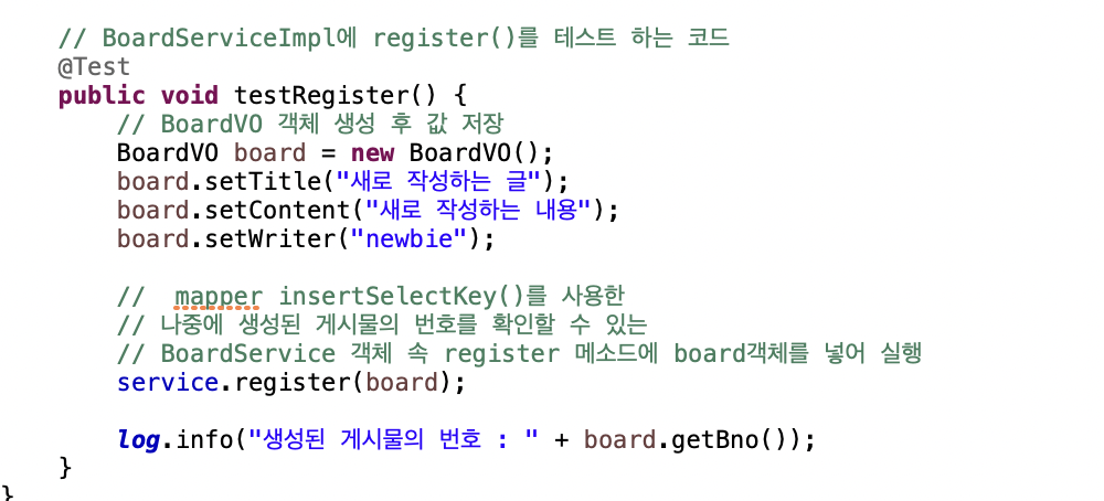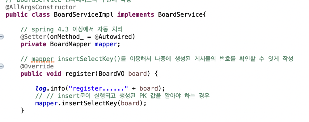 BoardService는 void 타입으로 설계되었으므로 mapper.insertSelectKey()의 반환 값인 int를 사용하고 있지 않지만 필요시 예외처리나 void 대신 int타입을 이용해서 사용할 수 있다.