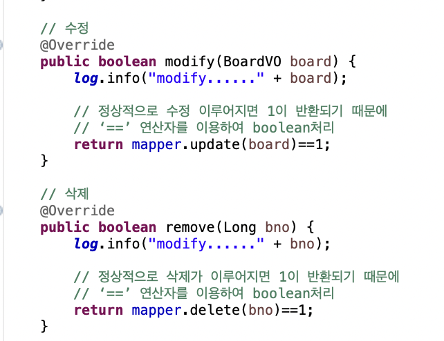정상적으로 수정, 삭제가 이루어지면 1이라는 값이 반환되기 때문에