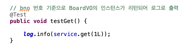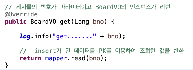 조회는 게시물의 번호가 파라미터이고 BoardVO의 인스턴스가 리턴이 된다.