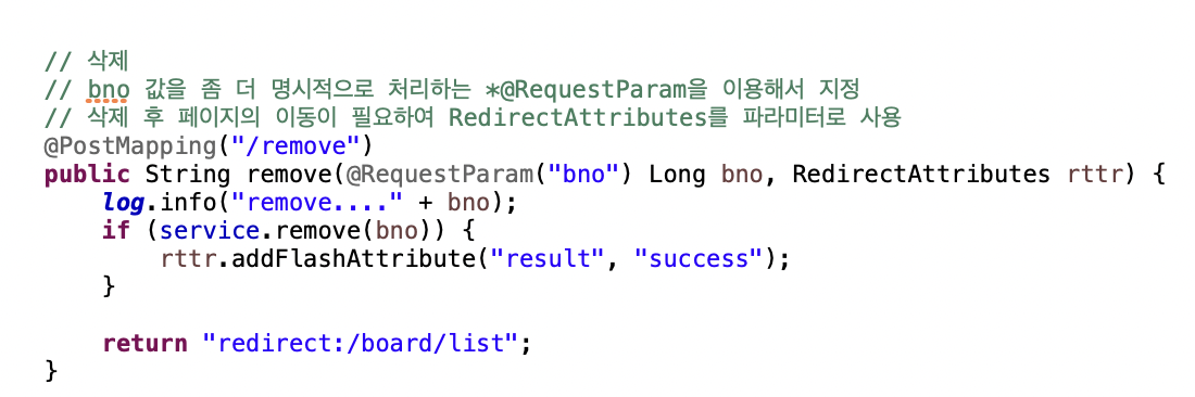 remove()는 삭제 후 페이지의 이동이 필요하여 RedirectAttributes를 파라미터로 사용하고