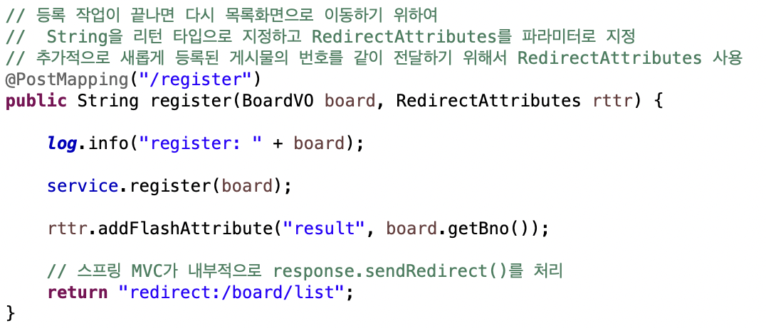 RedirectAttributes를 파라미터로 지정하면 이는 등록 작업이 끝나면 다시 지정한 화면으로 이동하기 위함