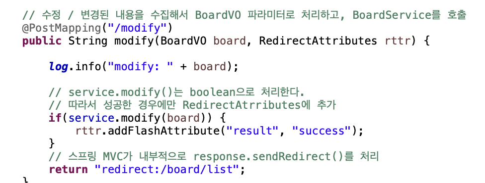 service.modify()는 수정 여부를 boolean으로 처리한다.